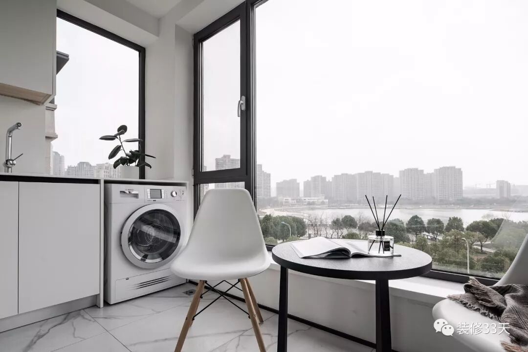▲ 阳台作为洗晒区与阳光休闲区,黑色圆形咖啡桌和一对白色弧形靠背椅搭配大面积的景观窗凭添一份适宜感