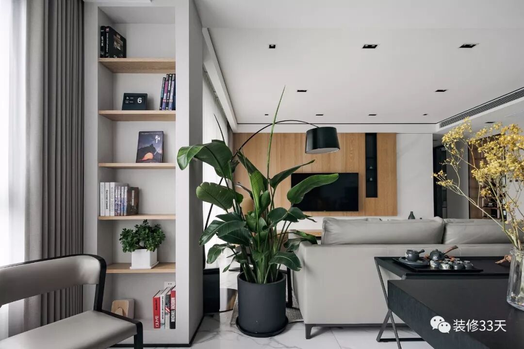 ▲ 打破空间壁垒,房屋变得宽敞大气,大量使用白与黑,无主灯简约吊顶预埋射灯,黑色边角线弱化空间大面积留白带来的苍白感,平衡视觉