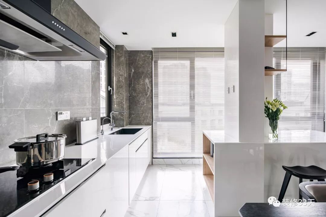 ▲ 将餐厨融合,开放式的场域,将不同的操作区进行合理分区,防水石膏板吊顶,黑钛镶嵌,内嵌式射灯让整体光源更舒适,右侧一体化的白色组合厨柜组中西门子烤箱、蒸箱一应俱全