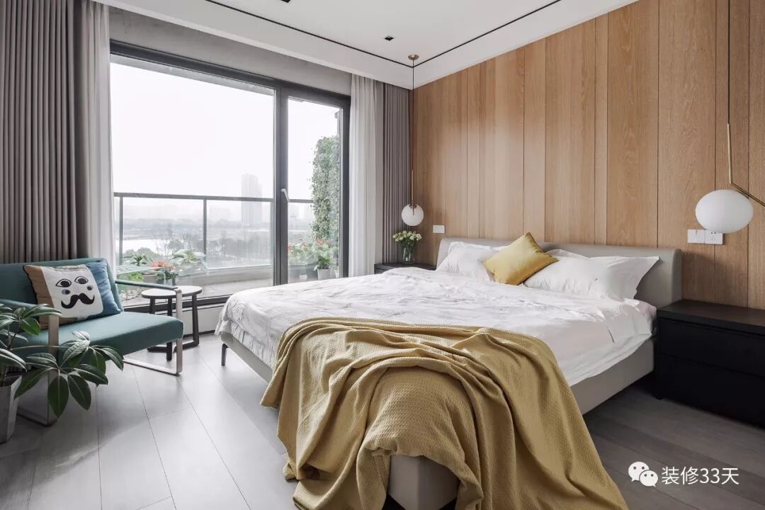 ▲ 客卧敲掉原本的飘窗,增加空间实用度,简约渐层纹理的壁纸与木纹地板相呼应,无靠背的实木床,一对INS风的单头床头吊灯,无处不体现着细节之美