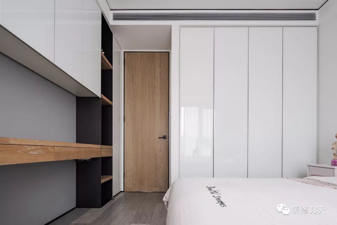 ▲ 主卫和卧室间的墙体镶嵌了磨砂玻璃,既增加卫生间采光,又弱化了白色墙体的刻板