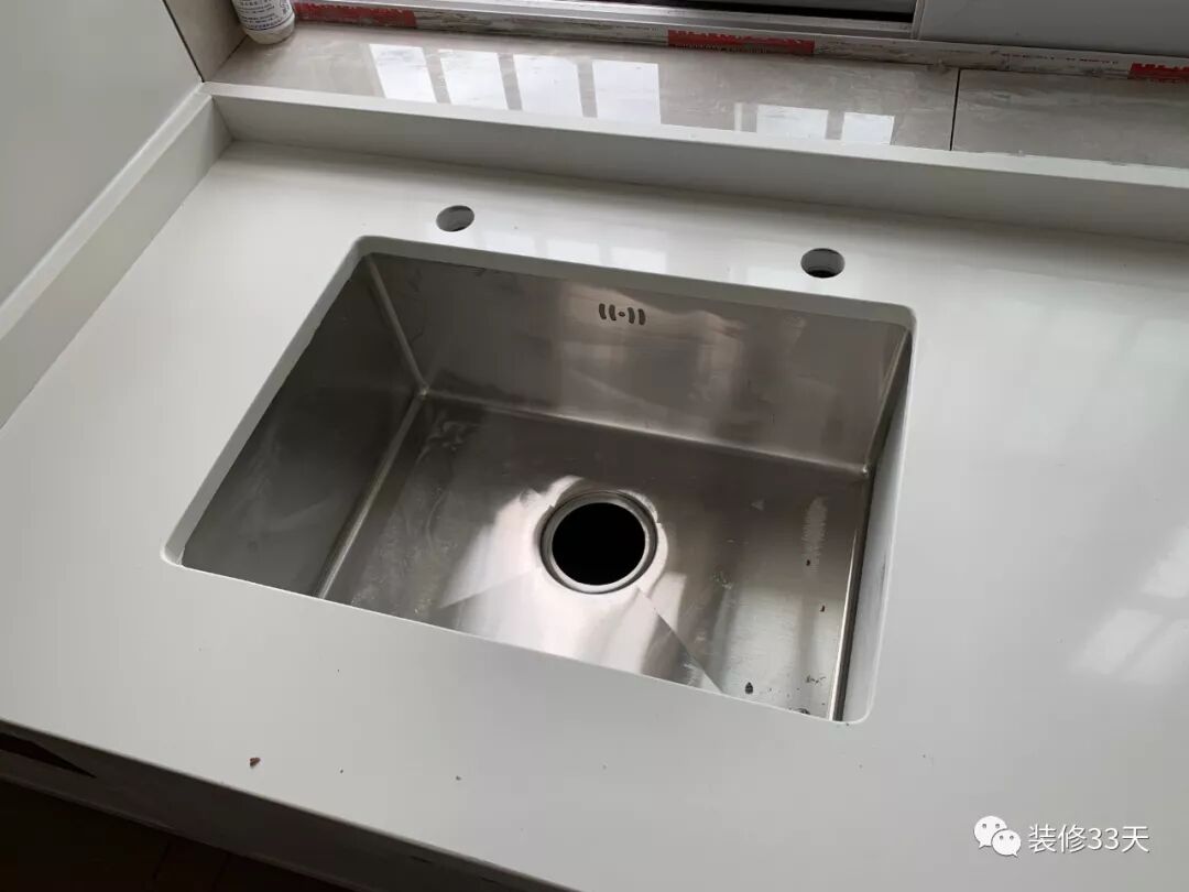 我这外面算西厨,装了个自己家55cm的小水槽,做的台下盆工艺,师傅现场粘的。台面整体上我觉得没问题,就是和窗台连接的位置,稍微比窗台高了几毫米,对于强迫症来说有点难受。