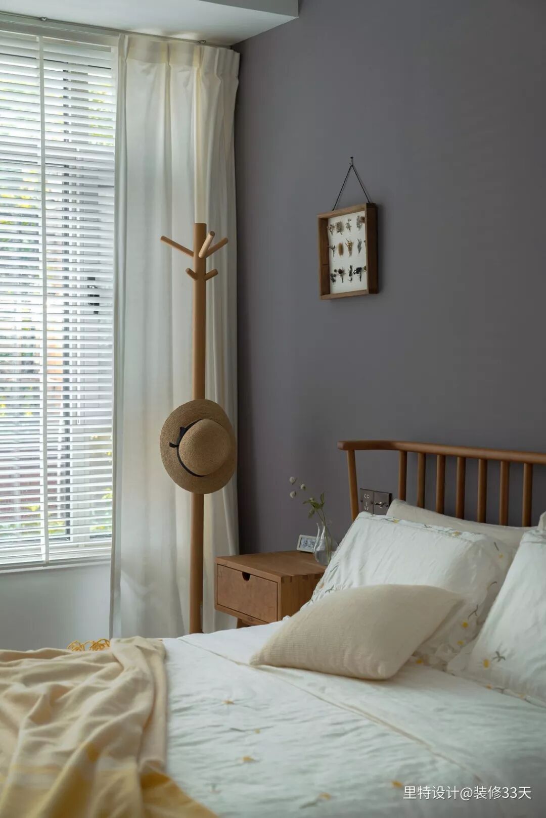 ▲ 将原始布局中的主卧改造成次卧空间,大面积景观窗采用白色百叶帘与棉质窗帘,让窗外的景致虚实可见,又能确保私密性