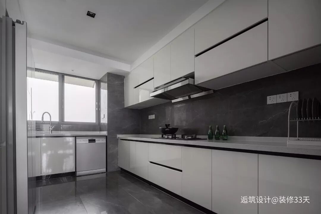 ▲ 将原结构的餐厨与生活阳台重组,规划出空间宽敞的厨房,整体的深灰色瓷砖搭配白色隐形拉手橱柜