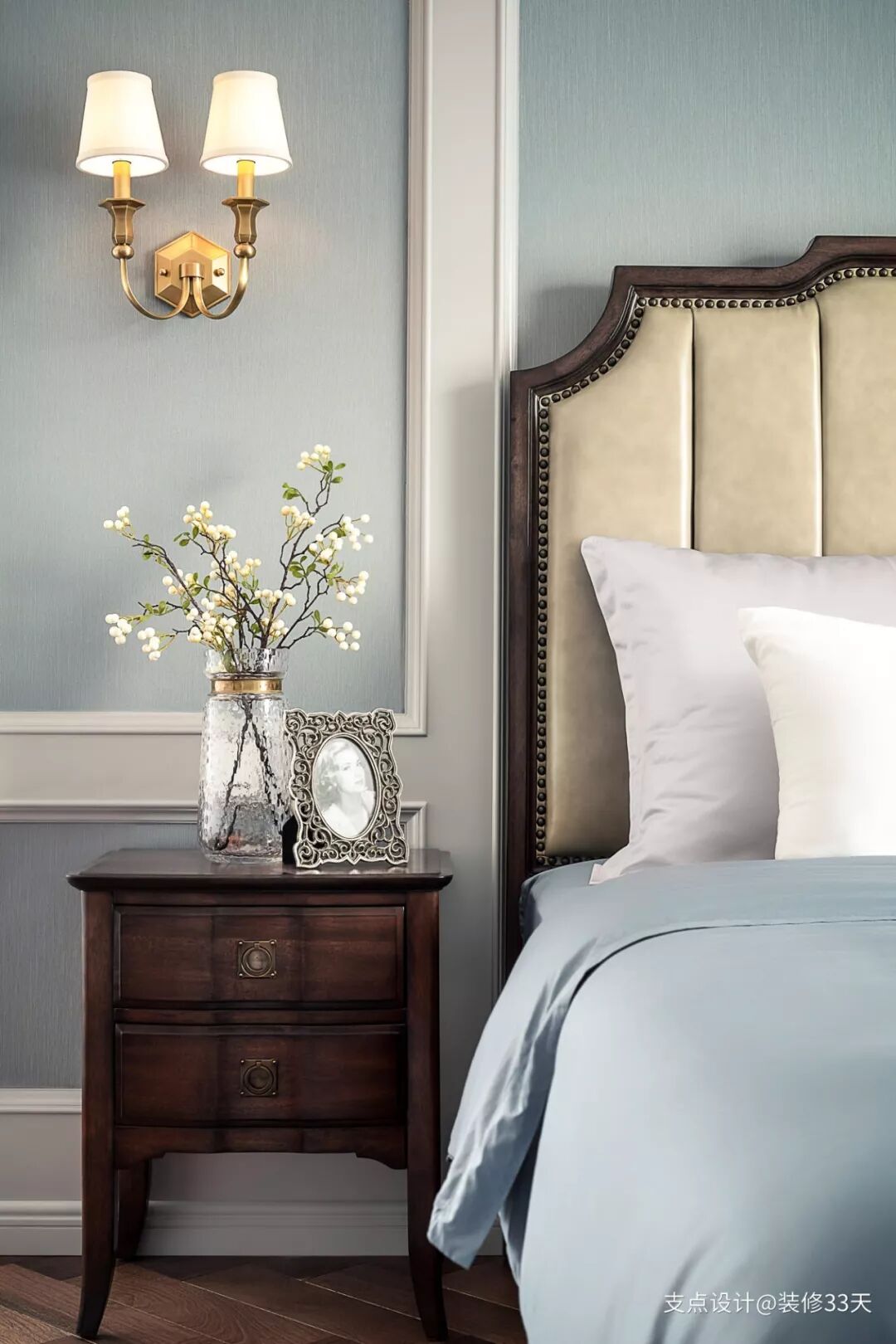 ▲ 美式高背床背景勾勒石膏线条,淡蓝色墙纸点缀金色壁灯,营造优雅浪漫的氛围