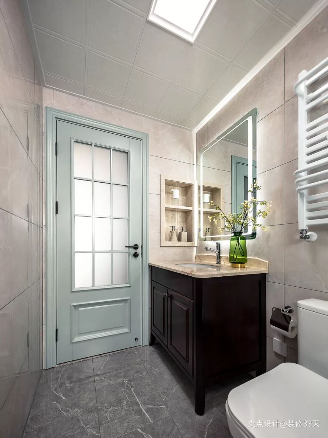 ▲ 卫生间,清新绿玻璃门透光不透影,镜面嵌入光源制造出悬浮效果,台盆侧墙设计壁龛,可以收纳常用洗漱品
