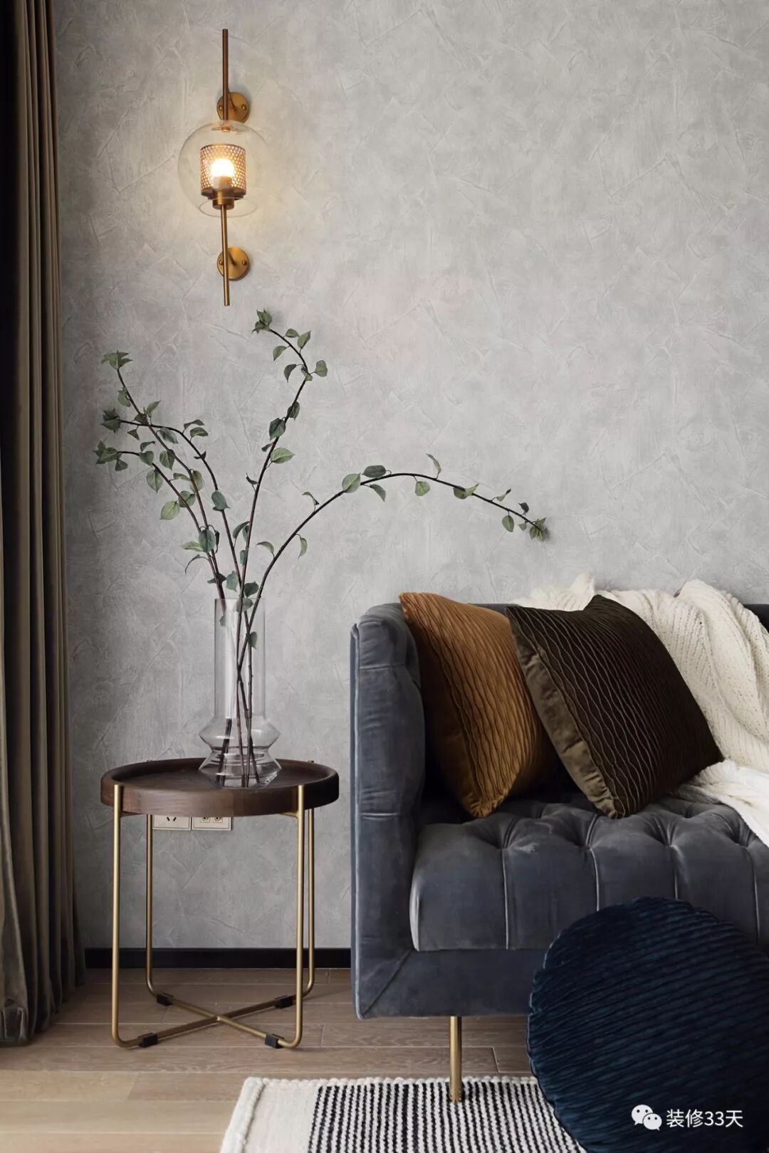 ▲ 重装吊顶后有效的改善了层高的限制,在色系上让工业感与精致住宅找平衡点,采用带有水泥纹理效果的壁纸铺贴沙发背景