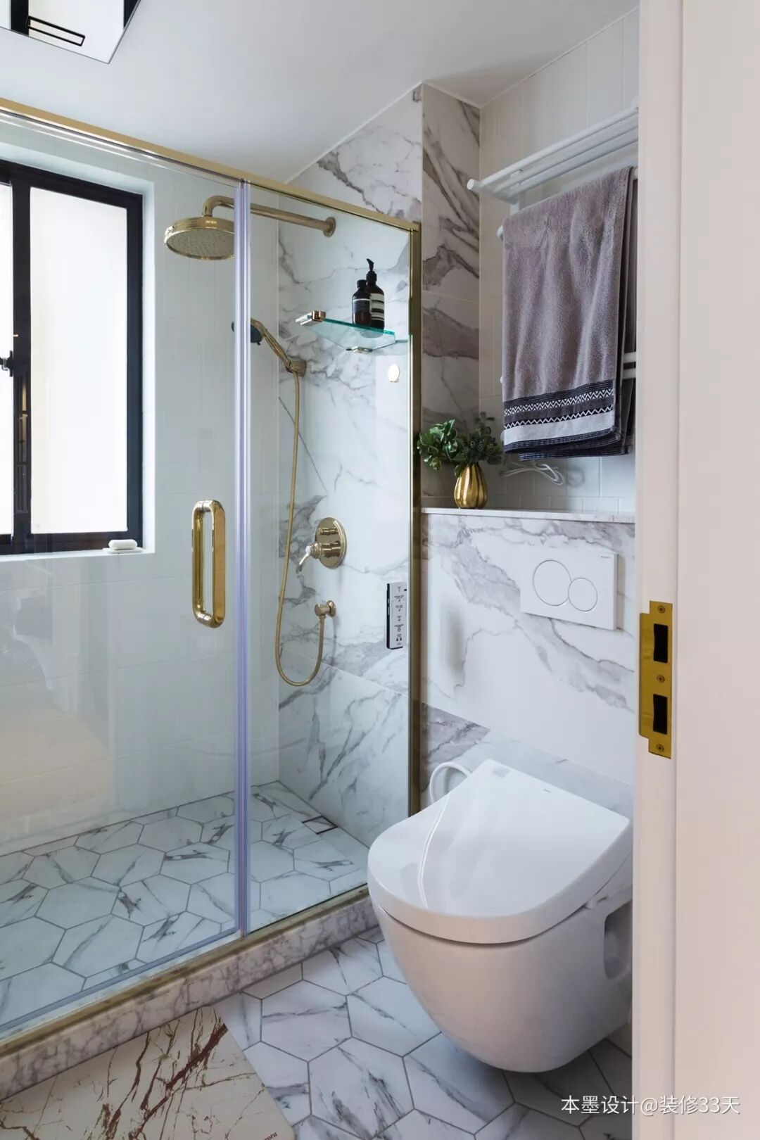 ▲ 卫生间湿区采用白色与大理石纹瓷砖铺贴,搭配金色元素五金,壁挂马桶,简洁大气