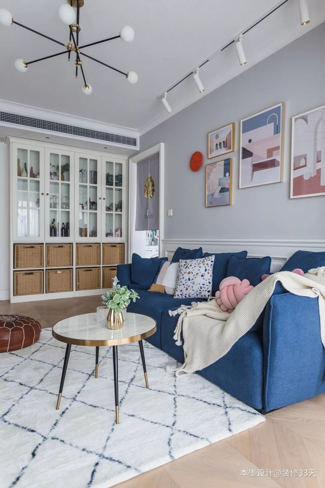 ▲ 阳台望向客厅,设计一组置顶墙柜,柜体上方采用玻璃柜门,避免落尘,易于打理,柜体下方设计置物格,辅以编制收纳筐