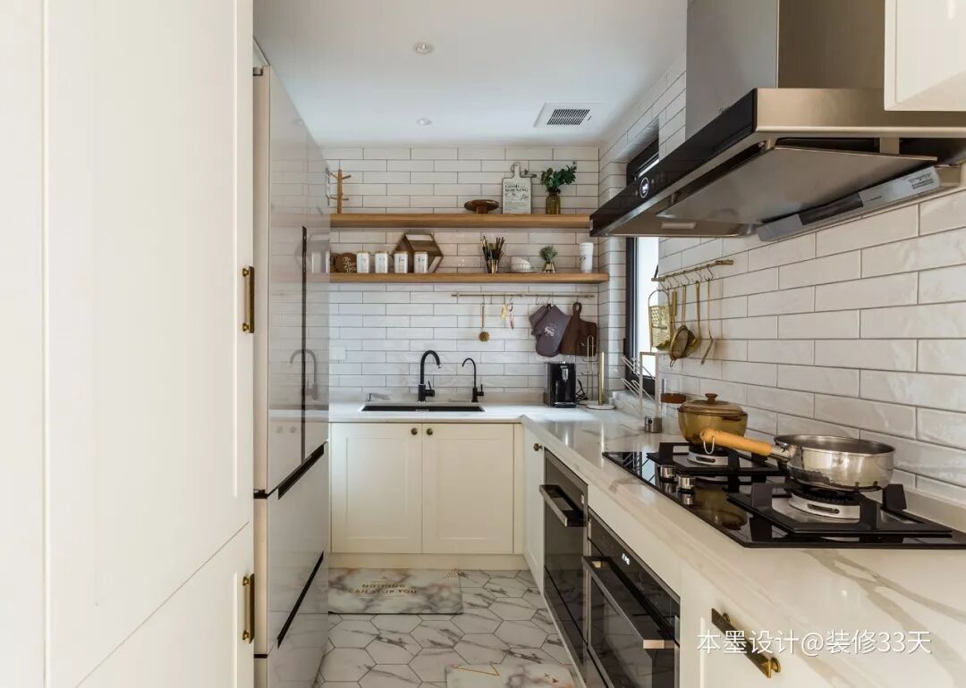 ▲ 开放原本逼仄的厨房,呈U型布局,大理石纹六边形地砖搭配工字铺白色条形墙砖,采用木质隔板取代吊柜