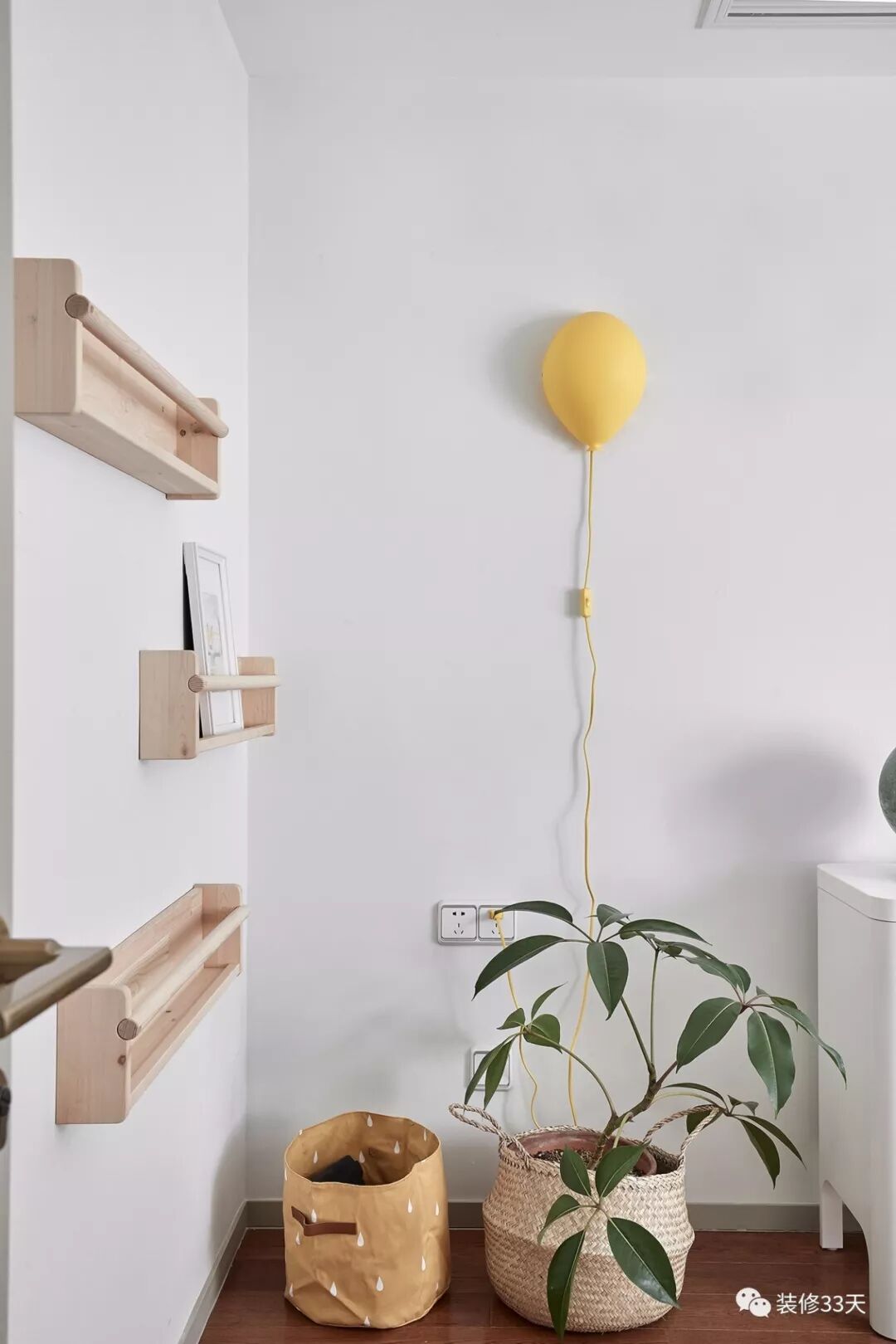 ▲ 儿童房,留白的空间更为简洁敞亮,墙壁上安装实木架与黄黄的气球灯,非常可爱