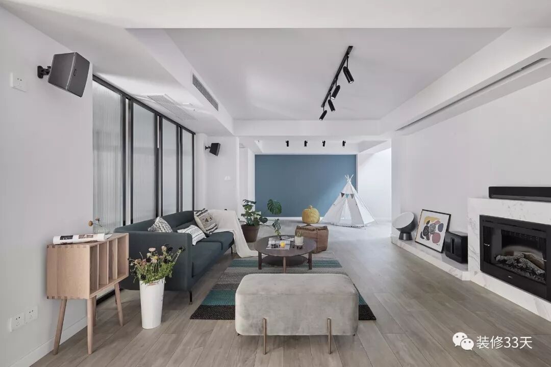▲ 影音室的另一边望去,刷一面蓝色端景墙,放置儿童帐篷,规划为儿童娱乐区
