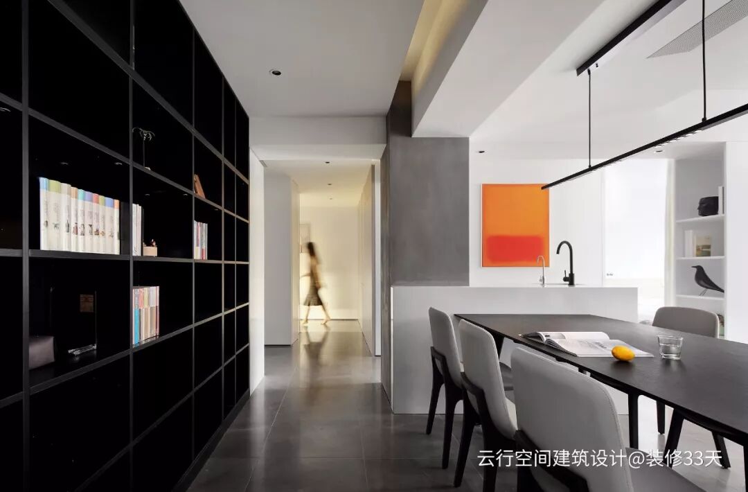 ▲ 餐厅后方设计整面的黑色书架墙,在过道的尽头用镜面,延伸了空间的视觉宽度