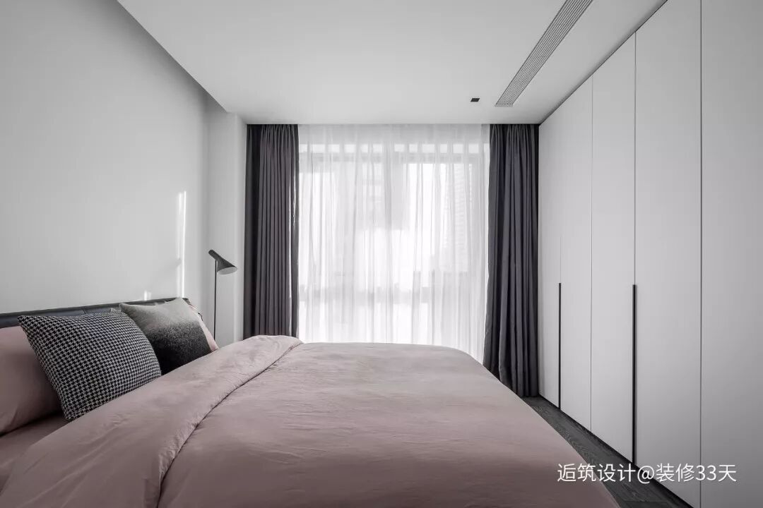 ▲ 次卧,粉色床品增添一丝俏皮可爱,床尾设置整墙白色柜体,黑色线性把手修饰