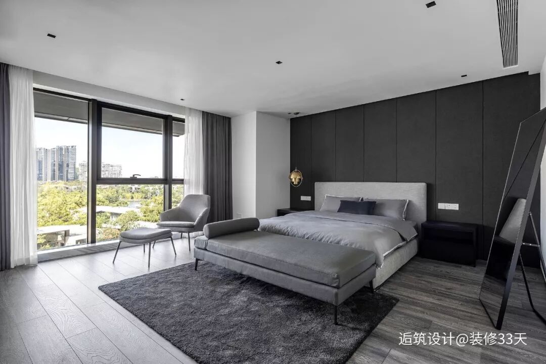 ▲ 主卧为套房格局,纳入衣帽间与卫生间,整体延续极简格调,黄铜元素吊灯带来轻奢质感,大面积落地窗拥有极佳的采光与视野