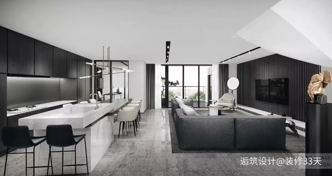 ▲ 客厅,选用灰色布艺沙发搭配黑白大理石茶几组,与空间色调呼应,超大景观阳台把阳光与景色映入室内