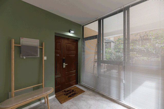 ▲ 入户玄关,选用流行的牛油果绿搭配白色,辅以木皮以及白色百叶元素,呈现高级实用的机能空间