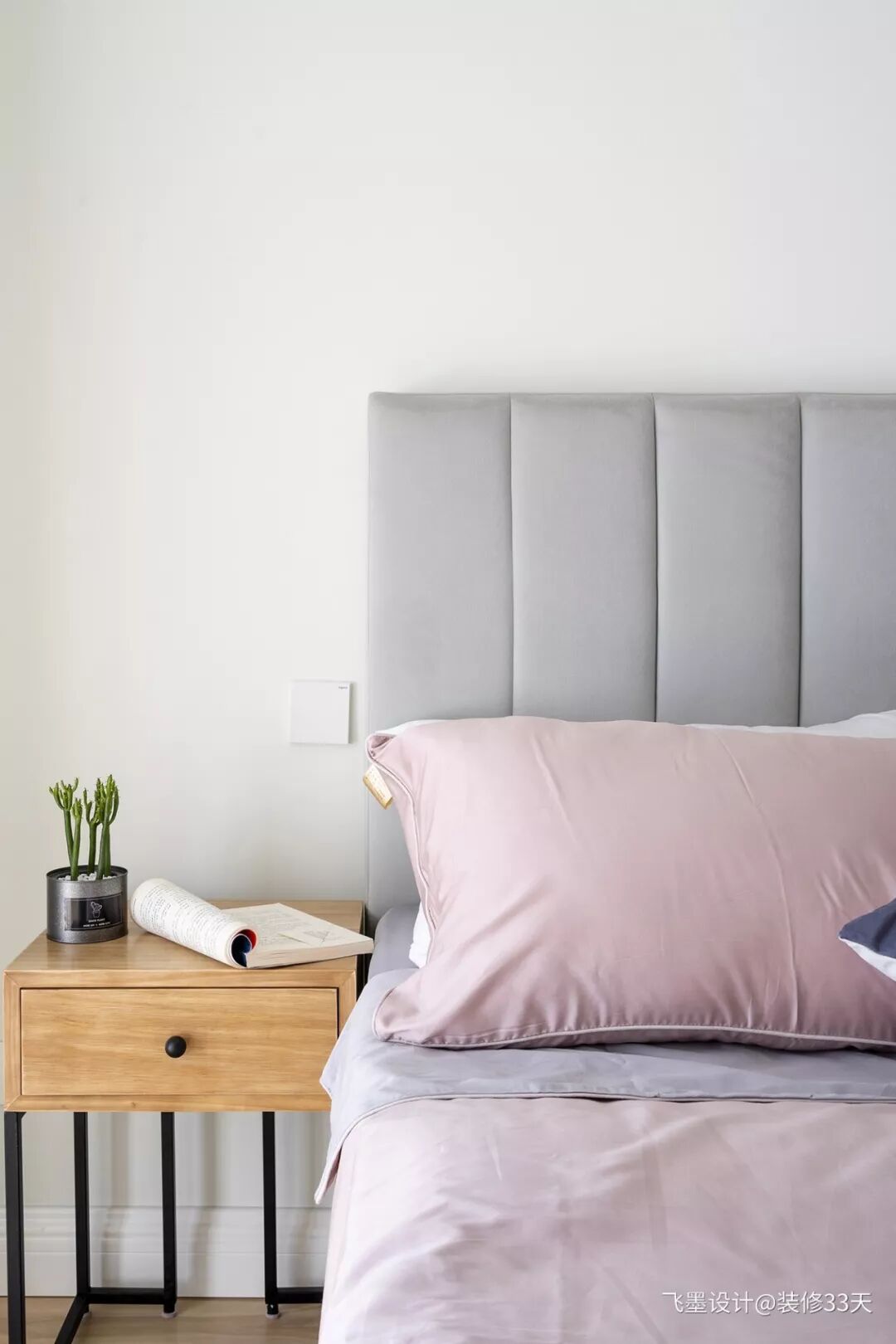 ▲ 次卧,纯粹的墙面无任何修饰,灰色高背大床搭配原木铁件床头柜,小小的仙人掌盆栽好养又好看