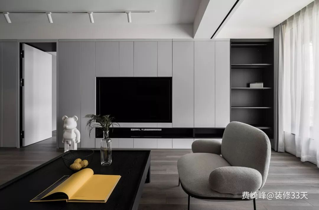 ▲ 浅灰色整墙电视柜,兼具大容量隐藏式收纳功能,同时隐藏主卧门片,顶面采用轨道射灯增加光感造型,整体背景大气、美观,又特别实用