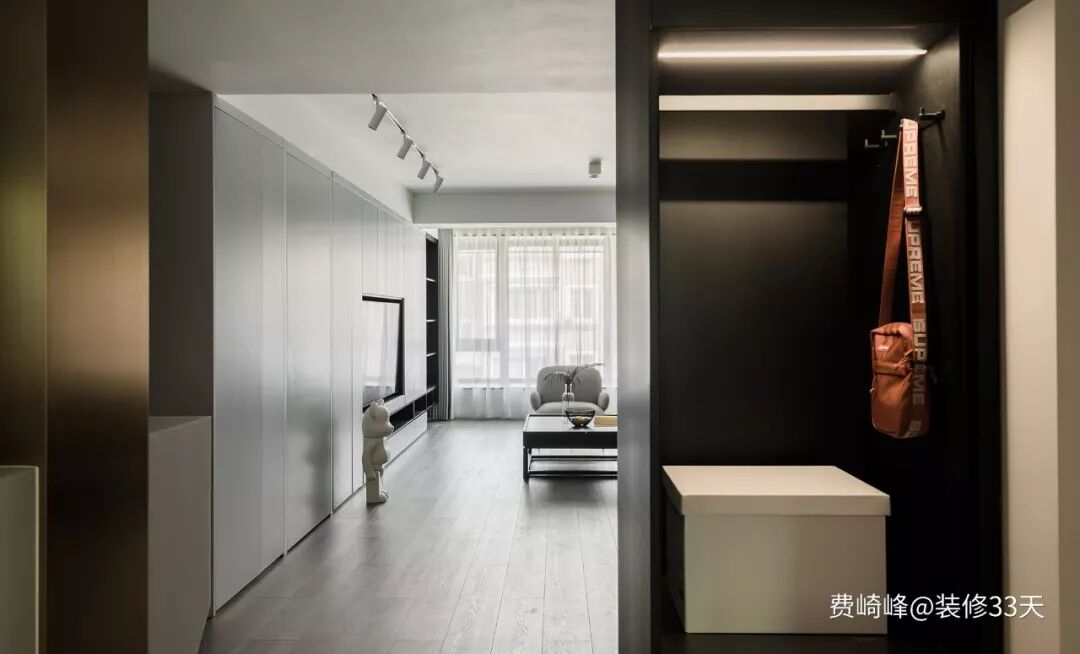 ▲ 使用面积90平,玄关处整体深色的低调处理,进门右侧设计一组实用的柜子,换鞋到收纳,随手挂衣帽功能俱全