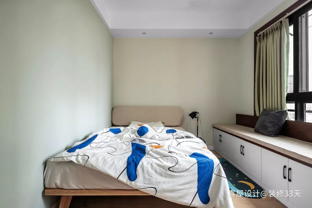 ▲ 色调清简的儿子房,窗台边现场制作飘窗柜加书桌的形式,实用、舒适又节省空间