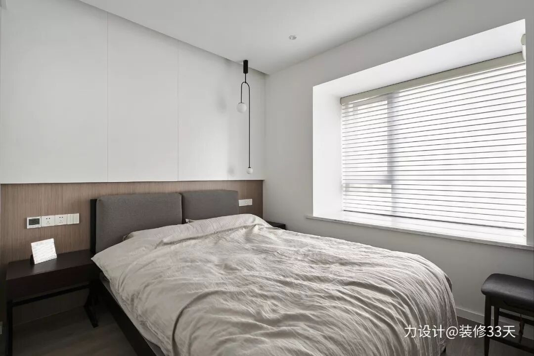 ▲ 主卧,留白空间搭配灰色棉麻床品,简单却富有质感,木饰面半墙温润自然,背景修饰现代造型吊灯
