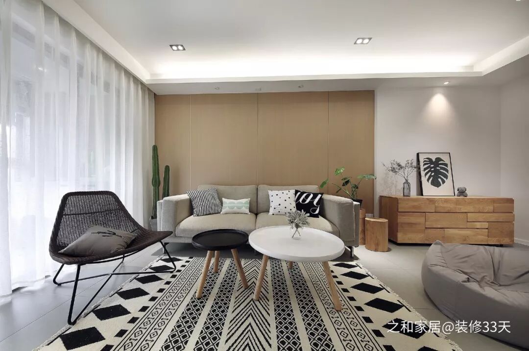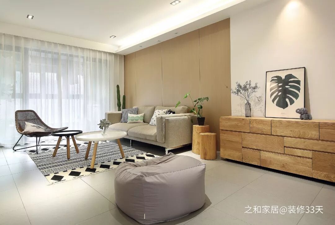 ▲ 客厅,地面通铺灰色水泥砖,大面积白色融合自然的木色,辅以绿植点缀清新居家