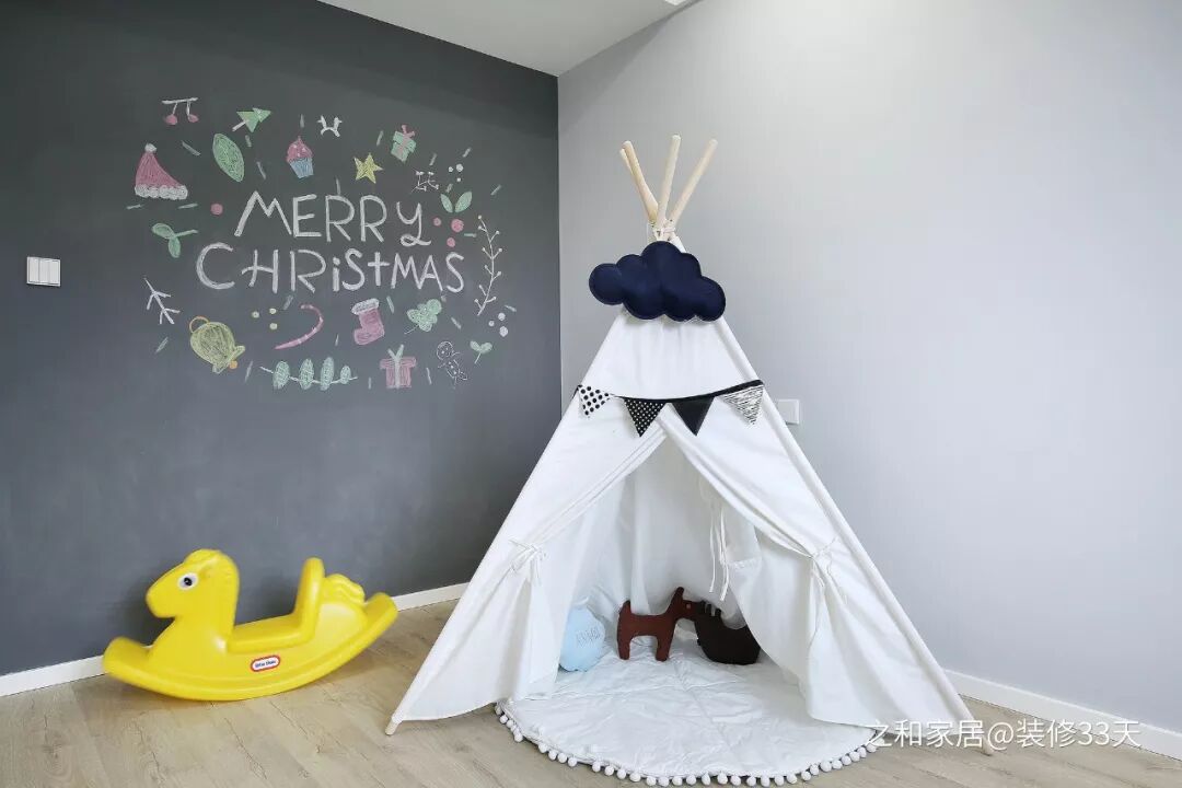 ▲ 儿童房的一面墙设计成黑板墙,搭配帐篷式的活动区域,亮黄色摇摆木马,为室内增添童趣