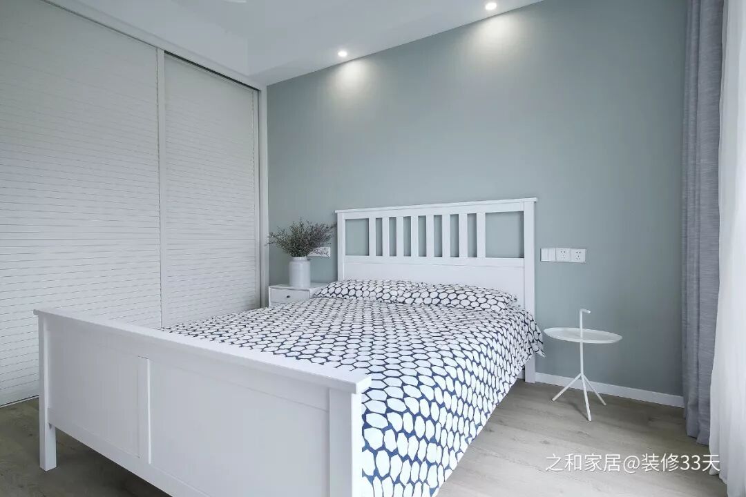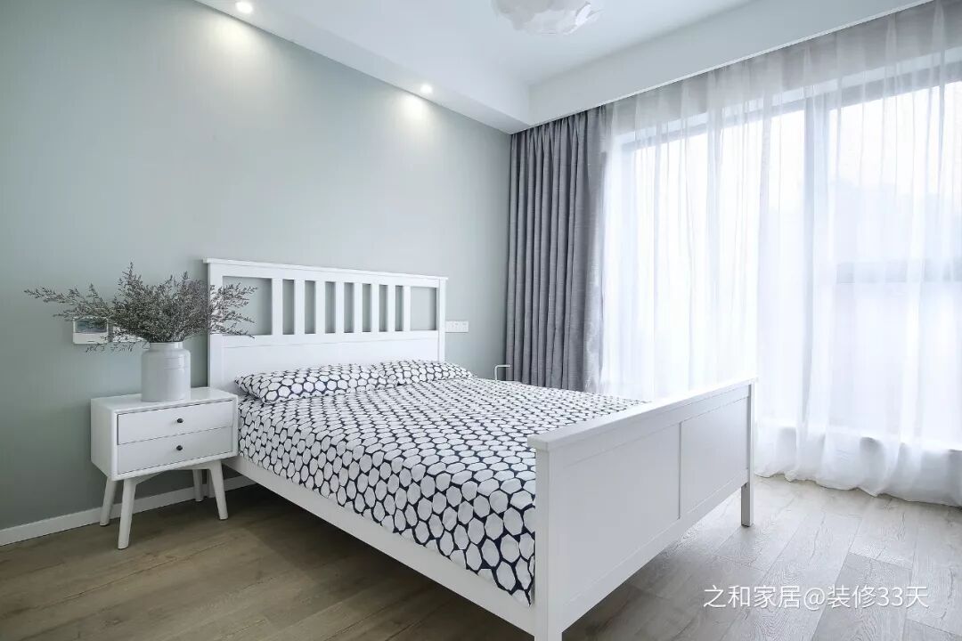 ▲ 次卧,大面积的采光窗搭配浅色系空间基调,灰绿色的墙面搭配宜家款白色床架,清新宜人