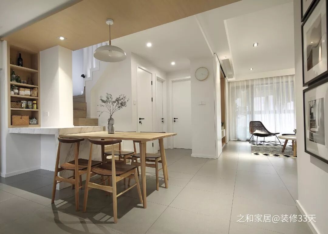 ▲ 大面积的白色搭配实木质感,提升空间精致度,餐厅过道的装饰画简约却层次分明