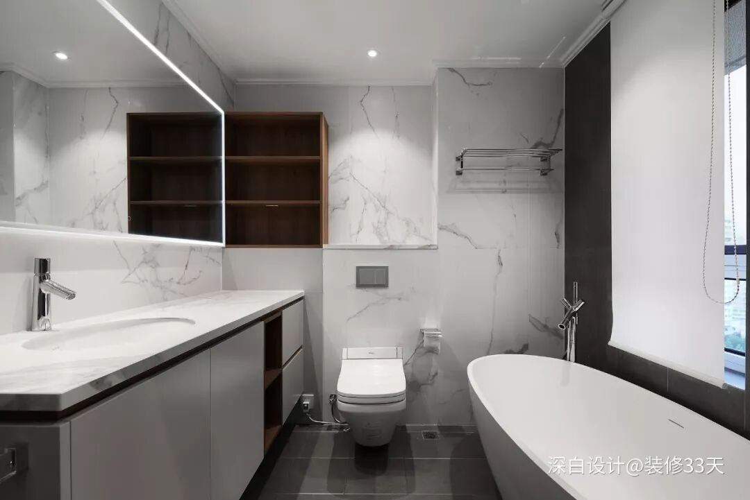 ▲ 主卫硬装风格延续厨房的格调,灰色防滑地砖搭配大理石墙砖,设置高颜值壁挂马桶与浴缸,白加木元素的柜体满足卫浴收纳需求
