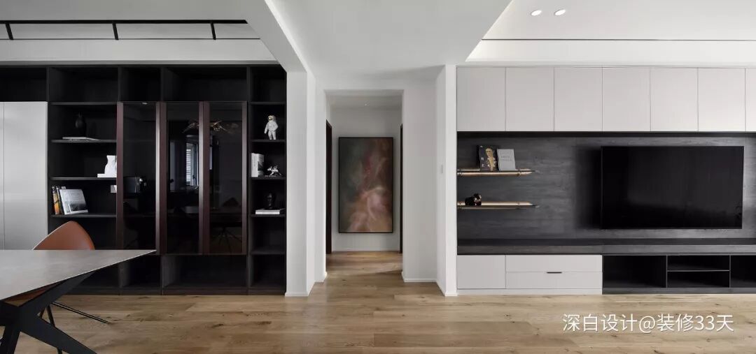 ▲ 过道将客餐厅无形分割,电视背景与餐厅背景的深浅配色,让居家显得冷峻时尚,层次分明