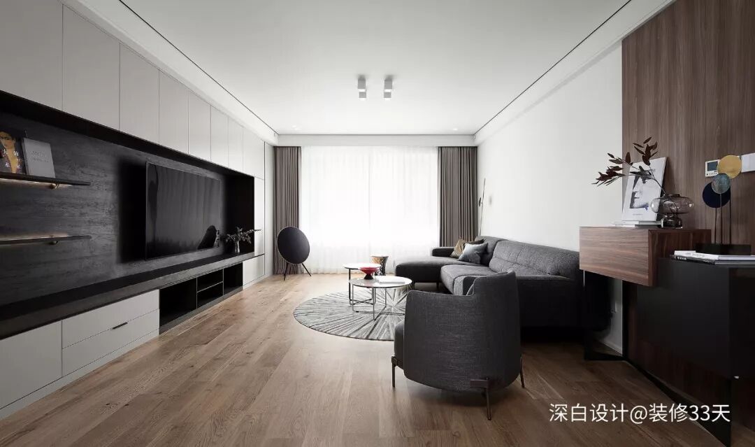 ▲ 使用面积145平,本案设计化繁为简,采用黑白灰辅以木色,局部软装点缀提亮居家