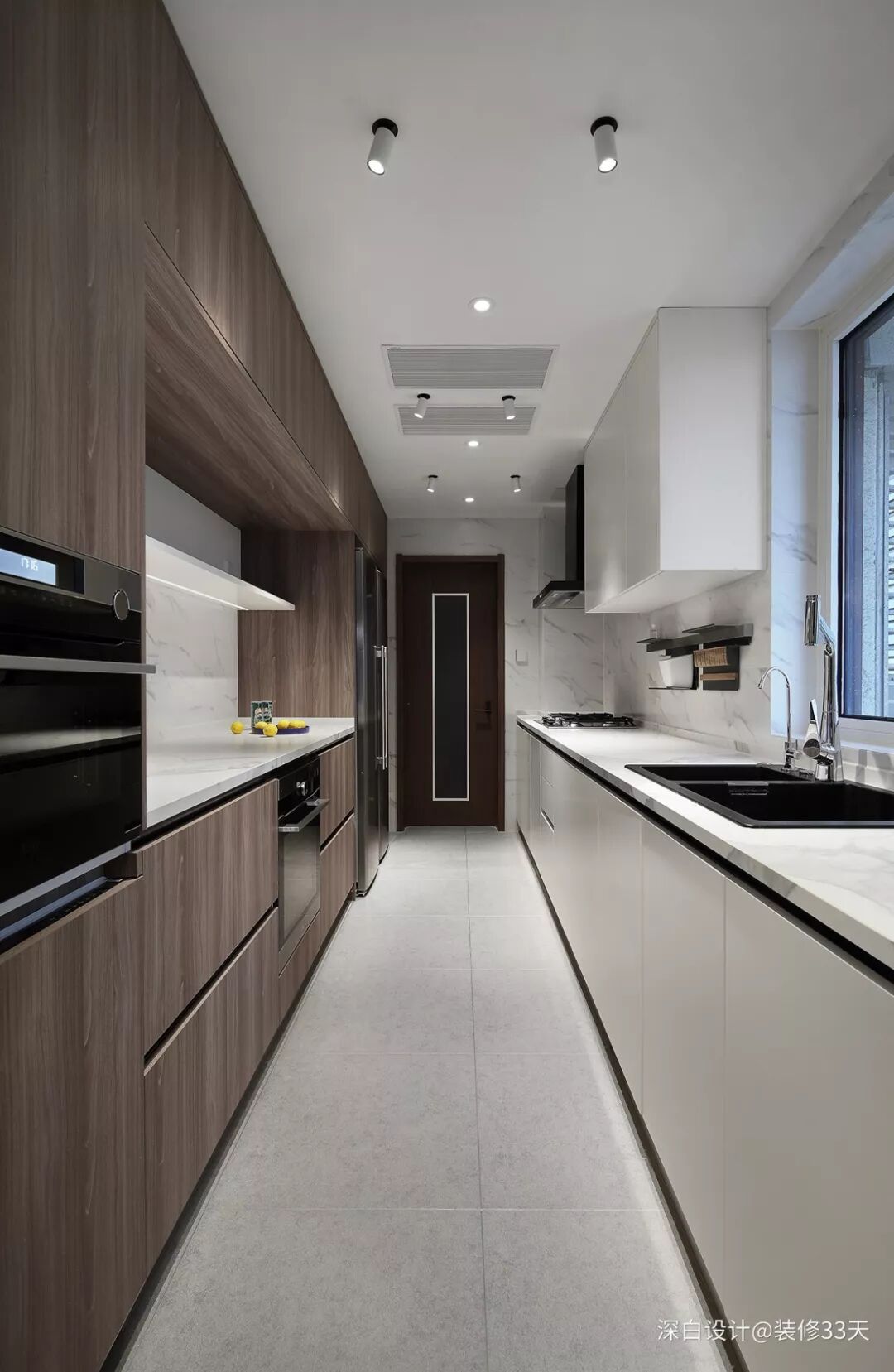 ▲ 厨房灰色防滑地砖,搭配大理石墙砖,利用木色橱柜营造反差感,木色橱柜满足大体积的厨电外,中部留空设计西厨料理台
