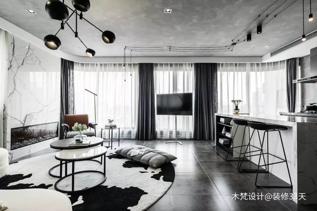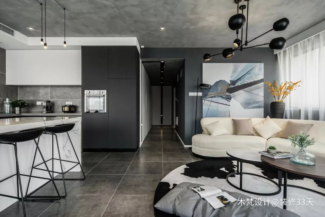 ▲ 公领域空间采用现代工业风的水泥漆顶和深灰色地砖互相呼应,白色石膏边的宽度留余视觉空间,避免灰度的压抑