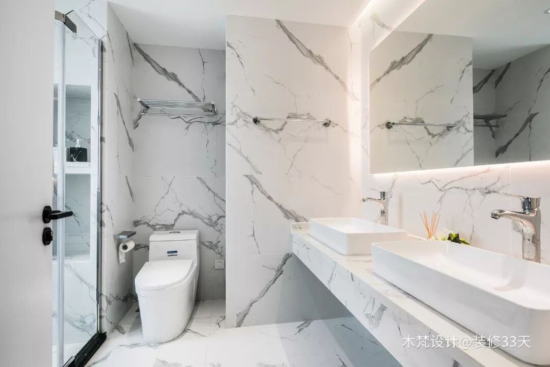 ▲ 主卧设置独立卫浴,墙地面以及双台盆洗手台整体通铺大理石纹瓷砖,大面积的镜面辅以隐藏灯带,呈现明快时尚的卫浴空间
