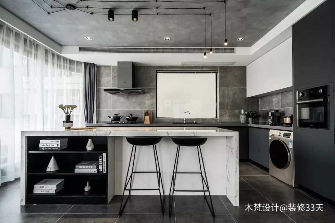 ▲ 设计开放式餐厨,以岛台为中心,形成环形动线,黑白灰的基调,大理石与金属的碰撞,厨房设备配置齐全