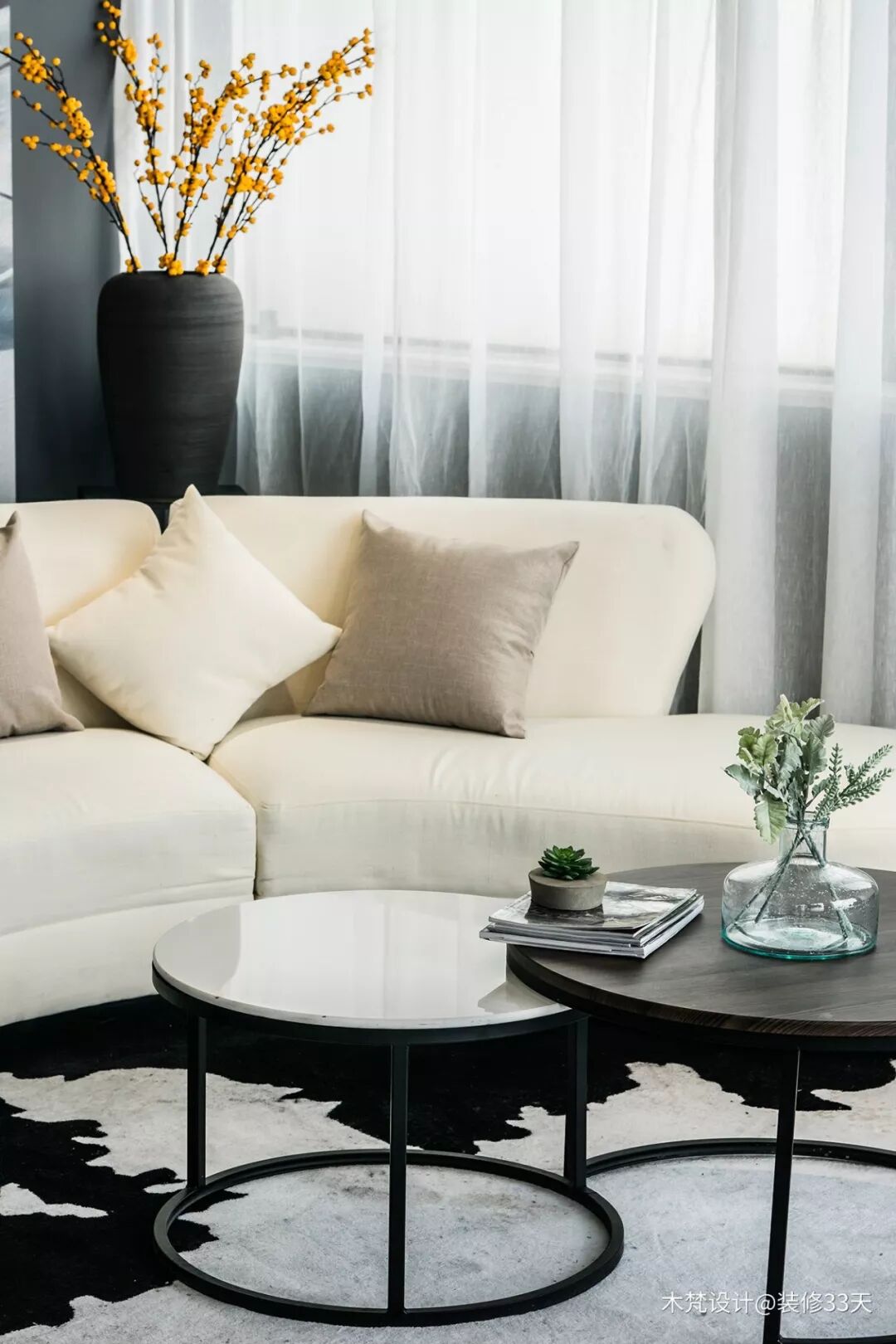 ▲ 客厅,一张厚实的大圆地毯,成为整个区域的核心,搭配圆弧造型的主沙发与轻便的圆形茶几组