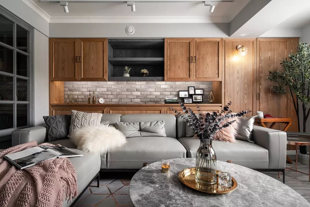 ▲ 客厅沙发背景也是一组柜子设计,收纳空间充足,被沙发挡住的下柜可以存放一些平时不常使用的物品