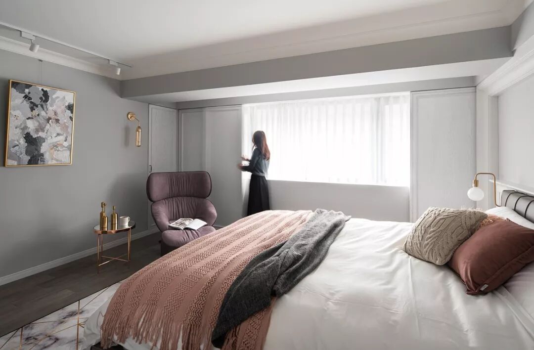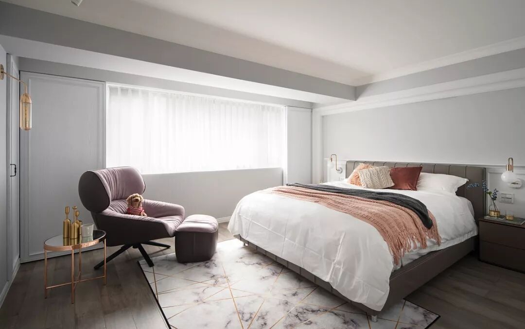 ▲ 卧室简单大气,以灰色为主调,简单的美式线框做床头背景设计
