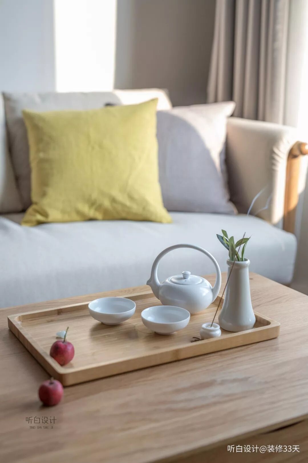 ▲ 布艺沙发+原木茶几,茶具配檀香,禅意四起