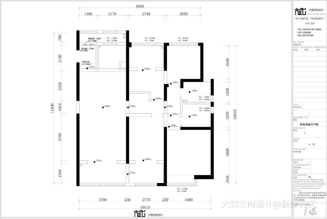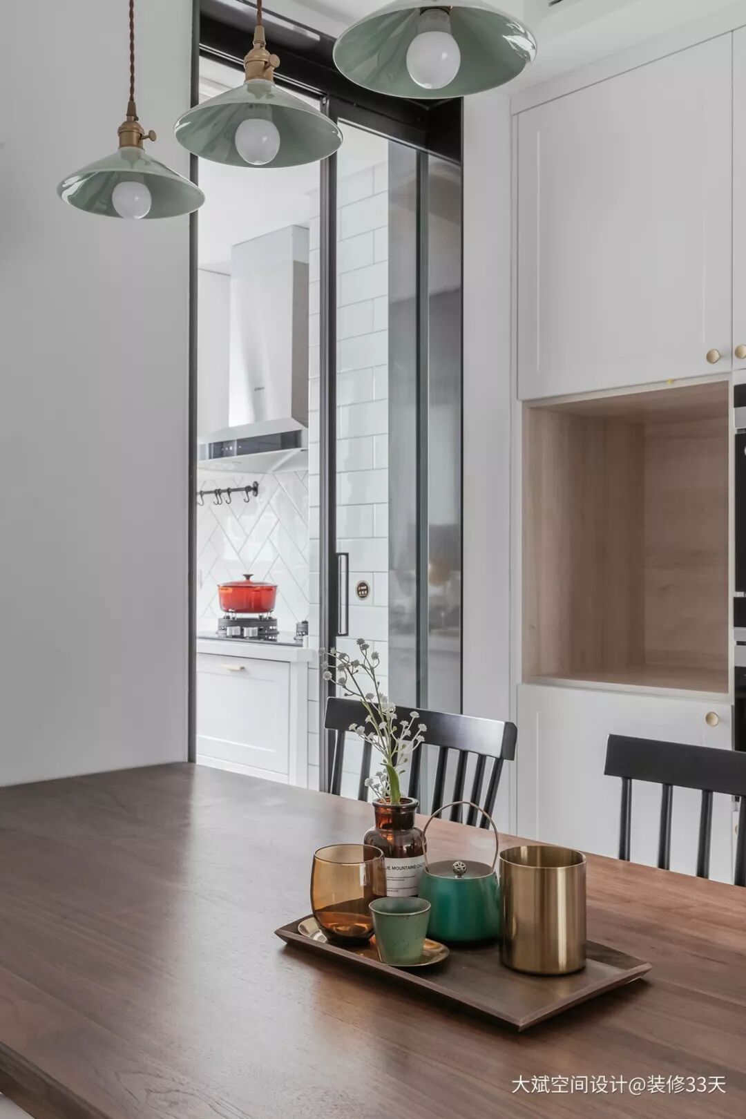▲ 餐厅望向厨房视角,采用黑框玻璃移门隔离油烟,厨房玻璃移门嵌入在北边墙体及高柜之间