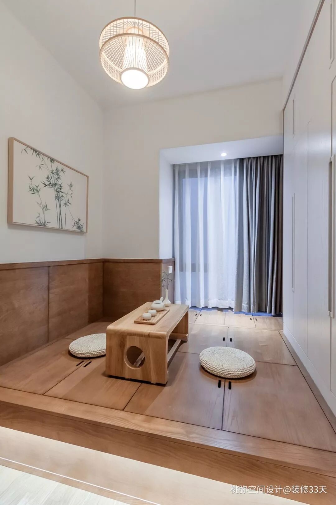 ▲ 多功能室,设计储物榻榻米,结合两面储物柜,为整室提供超大容量的收纳空间,硬装依然延续留白搭配原木,一幅翠竹装饰画点缀清新
