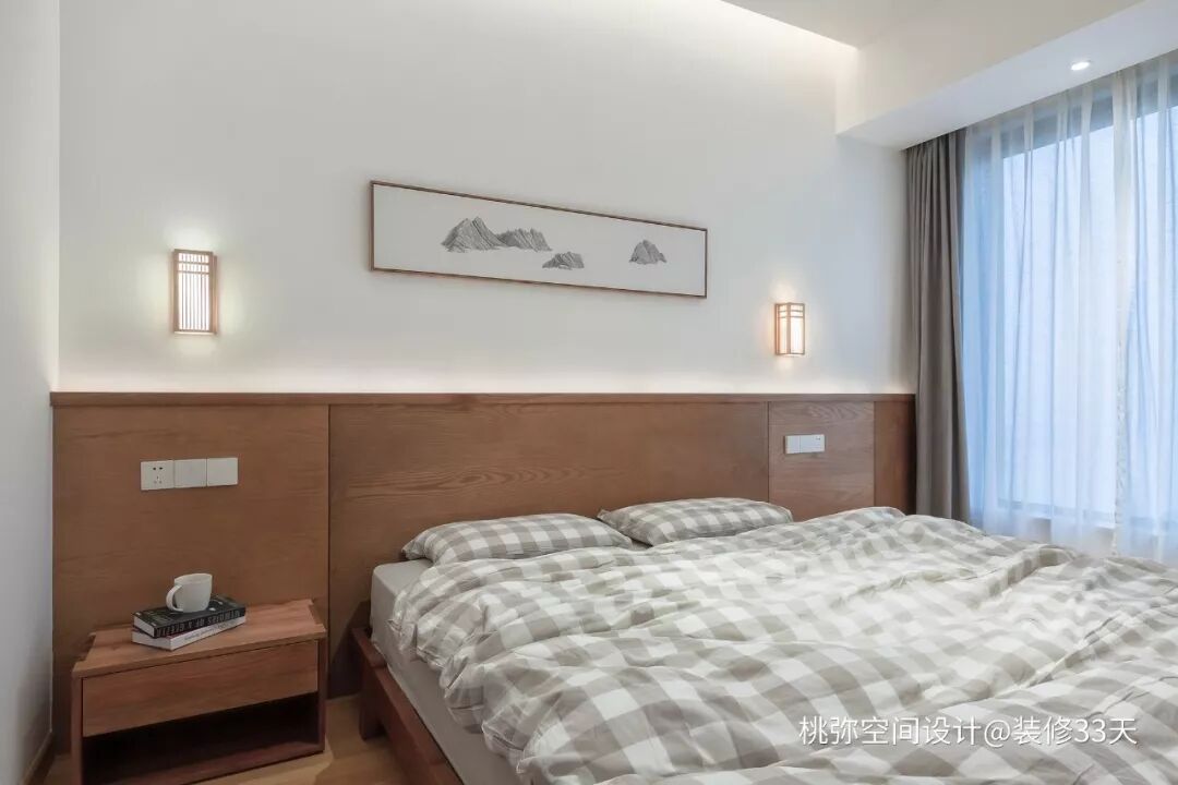 ▲ 主卧,将大衣柜移至床尾,设计一体式木质床头,内置灯带增加室内氛围,减轻柜体带来的压迫感,床背景上半部分留白饰以装饰画与对称壁灯