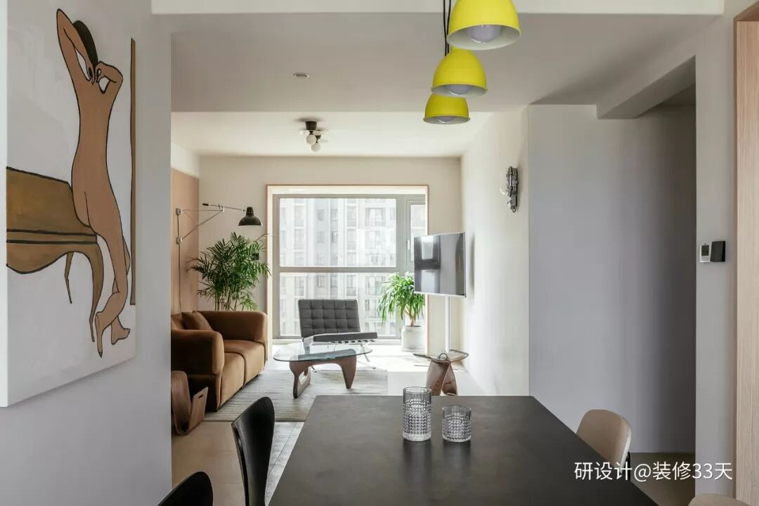 ▲ 餐厅,延续水泥灰地面搭配留白墙面,一幅临摹常玉的油画装饰背景,柠檬黄吊灯提亮空间色彩的饱和度