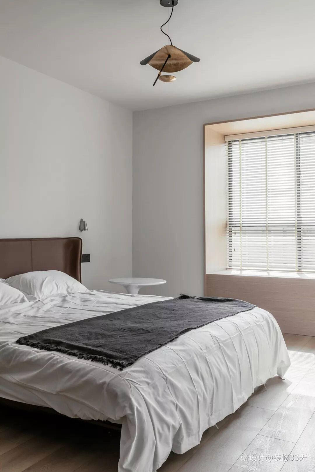▲ 主卧,自然色调的木质元素从地面一直延伸至飘窗,留白墙面搭配棕咖色皮质大床,造型吊灯充满艺术感