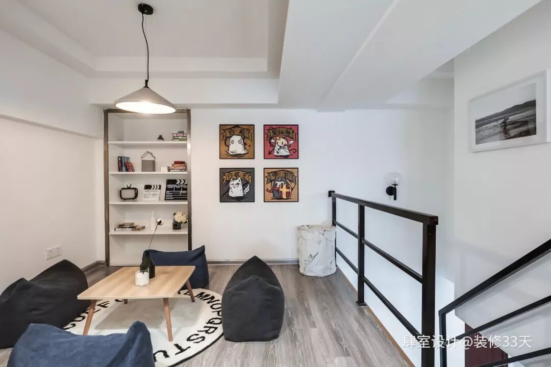 ▲ 开放式挂衣架+ins风阅读区,线性吊灯与装饰画营造主题与氛围