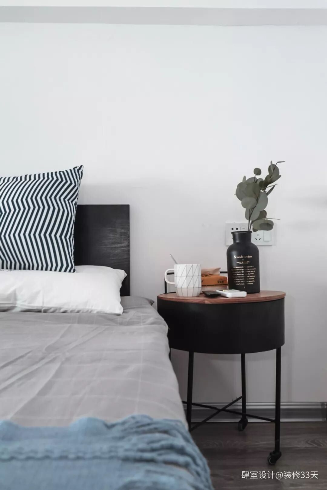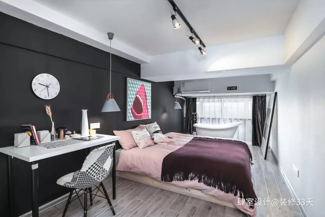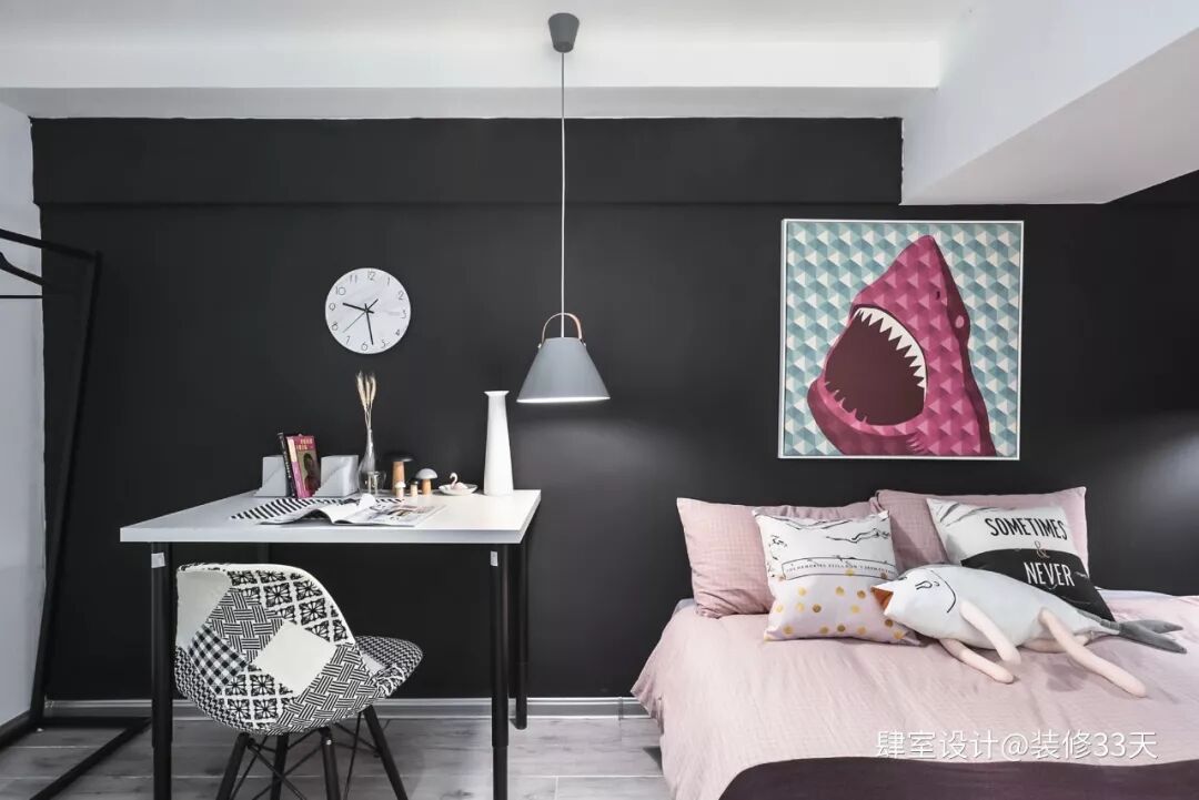▲ 卧室二,同样是黑白灰的主色调,加入了一抹温馨的粉色,冷暖色系搭配,大处见刚,细处见柔