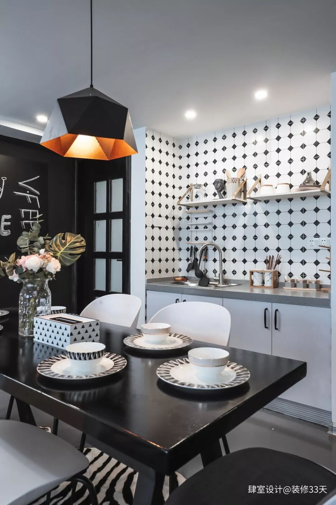 ▲ 餐厨相邻,动线简单合理,餐桌餐椅沿用黑白灰的基调,连餐具与灯饰风格也协调统一