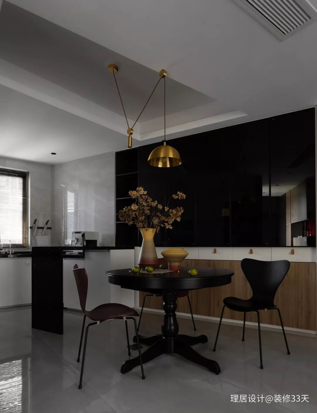 ▲ 移动式圆桌+镂空式小吧台设计,更适合用餐习惯相对简单的弟弟,黑玻餐边柜和金属细吊灯,BESTWEST 陶瓷星环纹理花瓶,再次利用不同材料丰富质感层次